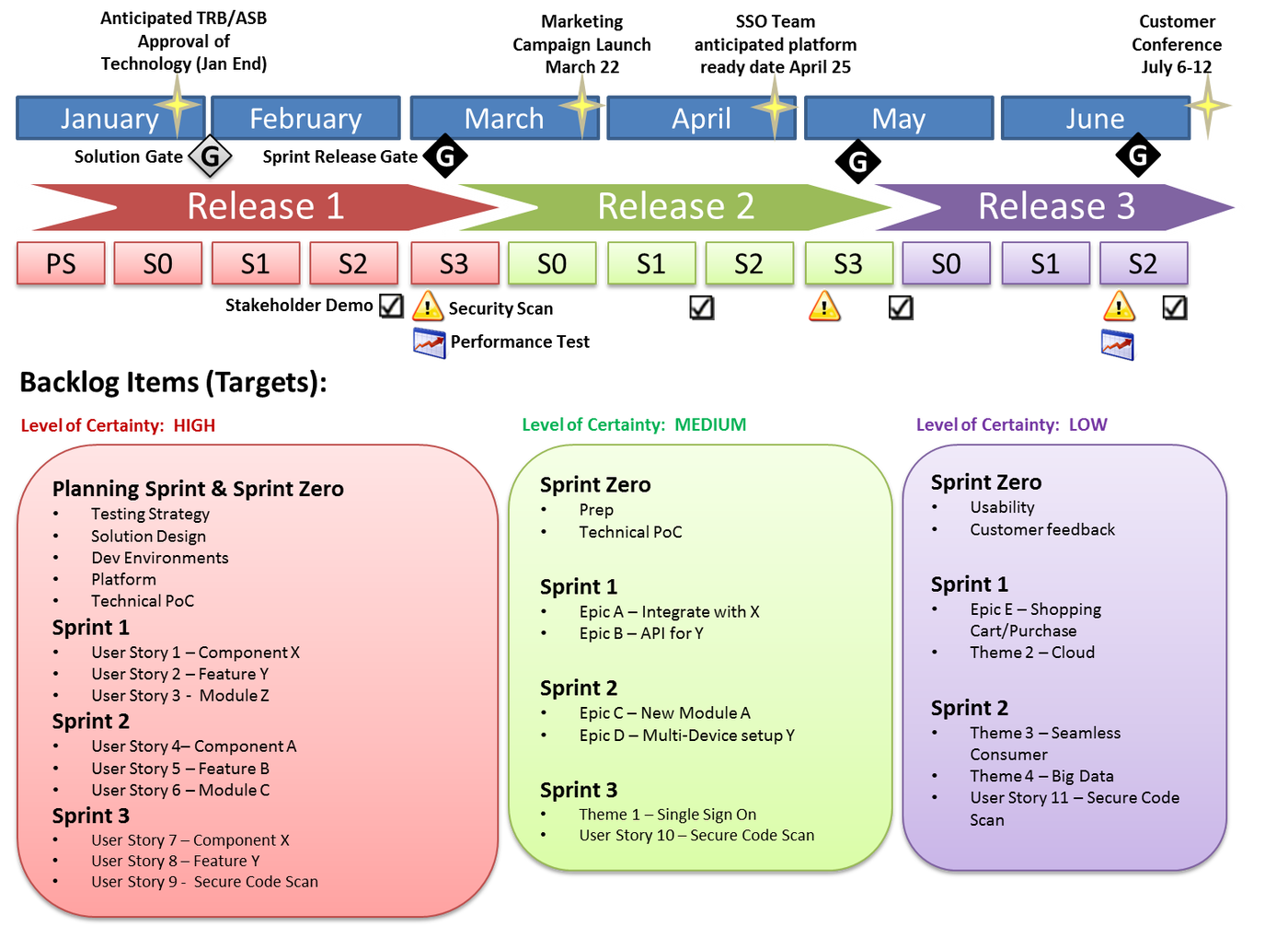The image below shows an example of a thorough and detailed Solution Roadmap. Note that it shows external outside-the-project dependencies (i.e. the “stars” on the top”), internal within-the-project dependencies (i.e. PMO gates, testing, and demos), planned releases, planned sprints, and tentatively slotted backlog items.