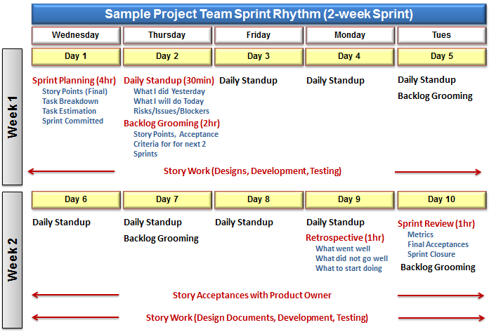 NOTE: The following is a sample Sprint rhythm used by Agile teams for a 2 week sprint
