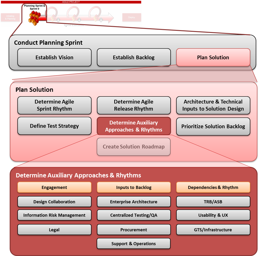The team should establish a high-level approach for the technology and architecture of the solution to rapidly enable development environments to be stood up and work to begin, as well as for TRB/ARB/ASB engagement to begin as soon as possible if it was not done already. To facilitate Agile Development, the team should try to establish Continuous Integration/Continuous Build architecture to enable the rapid verification and change needed in the Agile model. This will make testing and story acceptance easier later in the process. For Agile projects, it is understood that the solution design will be maintained using Agile principles of documenting only to the extent which adds value at that point in time. In line with this, Agile teams should complete as much information as is known during their planning sprint, and then update the solution design frequently as the individual user stories, features, and components are designed during the subsequent sprints. For Agile teams, the solution design might also be maintained in a project wiki, and if so please be sure to reference the solution design artifact template, which provides a good structure for your team to follow in its wiki, which will then be standard for LAUNCH LEGENDS. |