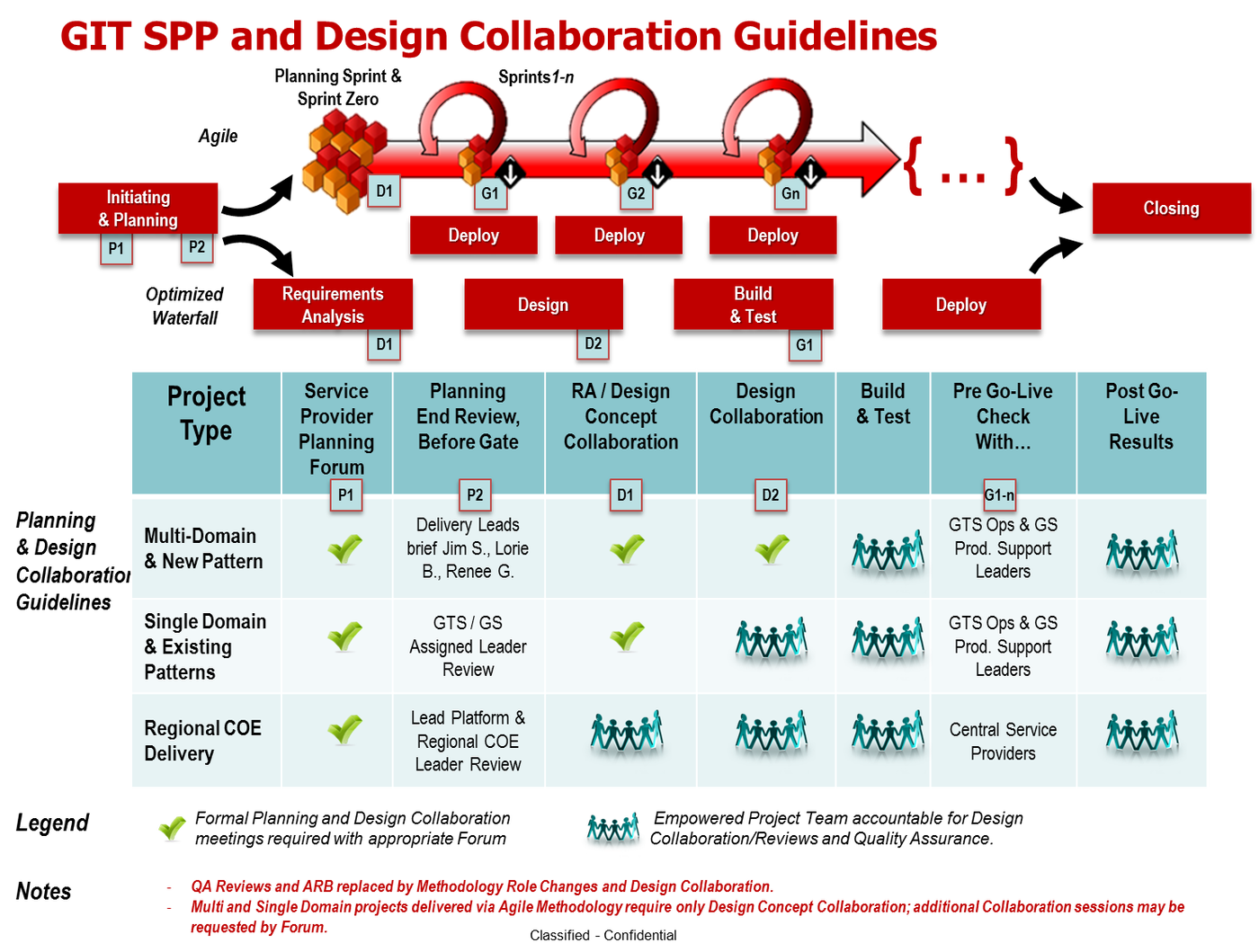GIT Design Collaboration is a follow-up to the Service Provider Planning (SPP) process that occurs during Initiate & Plan (I&P). During that process step, the team is informed of the design collaboration path required for the project. Design collaboration is required for projects classified as Single Domain/Existing Patterns or Multi-Domain/New Patterns in the SPP process. For most of these projects, only the Design Concept Collaboration step (D1 in diagram below) is required. For select projects, the forum may request that the team return for a 2nd Design Collaboration session at a key point in later sprints. Projects following Agile methodology will engage the Design Collaboration process during the planning sprint.